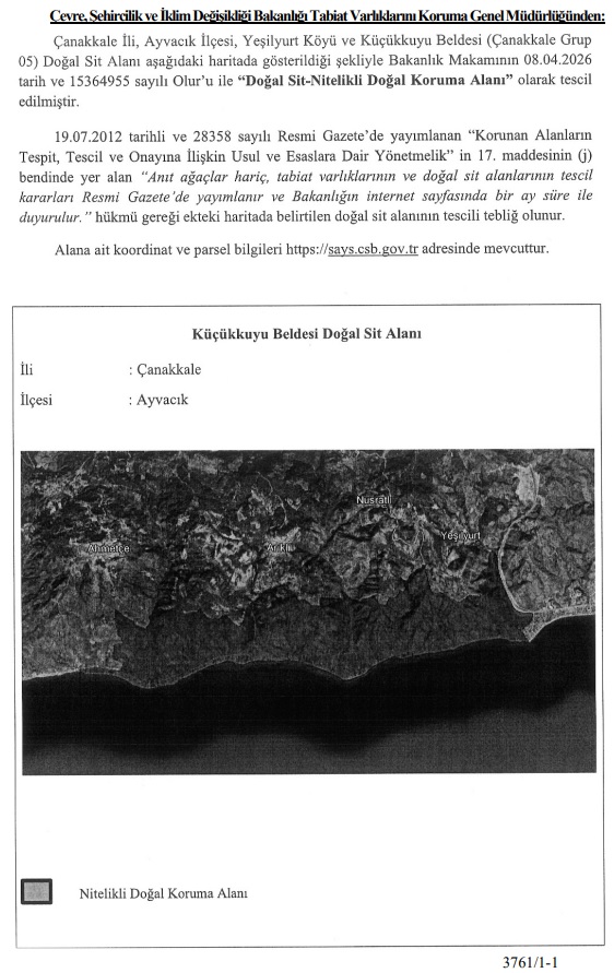 İlimiz Ayvacık İlçesi, Yeşilyurt Köyü ve Küçükkuyu Beldesi sınırları içerisinde yer alan Çanakkale Grup 05-01 Doğal Sit Alanlarının koruma statüsünün "Nitelikli Doğal Koruma Alanı" olarak tescil edilmesini içeren, Çanakkale Tabiat Varlıklarını Koruma Bölge Komisyonu’nun 25.12.2025 tarihli ve 3290 sayılı kararına istinaden 1 No'lu Cumhurbaşkanlığı Kararnamesinin 109/2’nci maddesine göre söz konusu alandaki "Nitelikli Doğal Koruma Alanı"na dair tescil kararı 08.04.2026 tarihli ve 15364955 sayılı Bakanlık Olur’u ile onaylanmış 15.04.2026 tarih ve 33225 sayılı Resmi Gazete'de yayımlanmıştır.