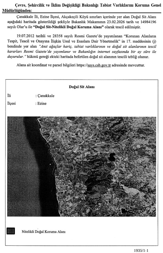 İlimiz Ezine İlçesi, Akçakeçili, Alemşah ve Uluköy Köyleri sınırları içerisinde yer alan Çanakkale Grup 06-13 Doğal Sit Alanlarının koruma statüsünün "Nitelikli Doğal Koruma Alanı" olarak tescil edilmesini içeren, Çanakkale Tabiat Varlıklarını Koruma Bölge Komisyonu’nun 16.06.2023 tarihli ve 1997 sayılı kararına istinaden 1 No'lu Cumhurbaşkanlığı Kararnamesinin 109/2’nci maddesine göre söz konusu alandaki "Nitelikli Doğal Koruma Alanı"na dair tescil kararı 23.02.2026 tarihli ve 14984196 sayılı Bakanlık Olur’u ile onaylanmış 28.02.2026 tarih ve 33182 sayılı Resmi Gazete'de yayımlanmıştır.