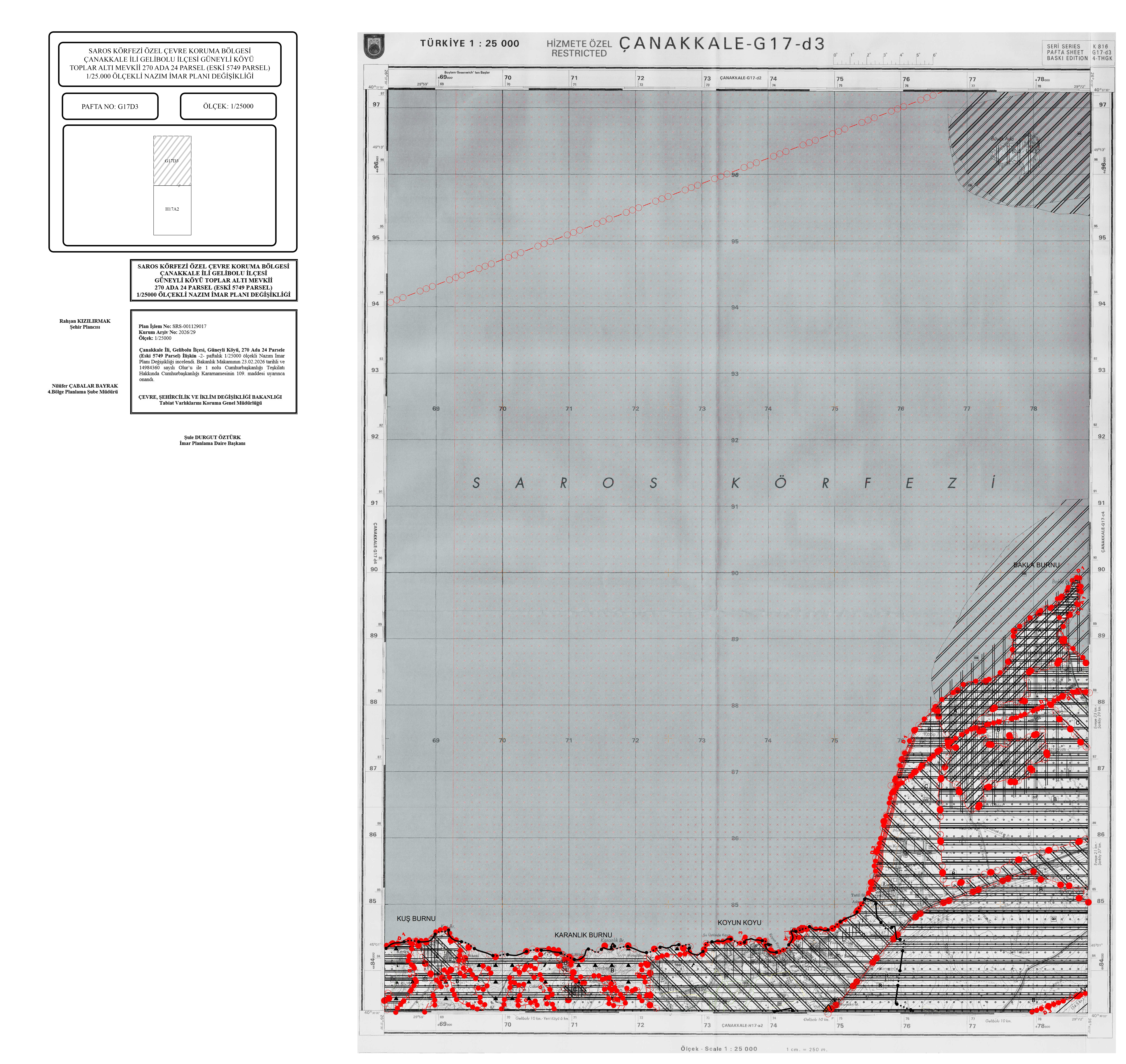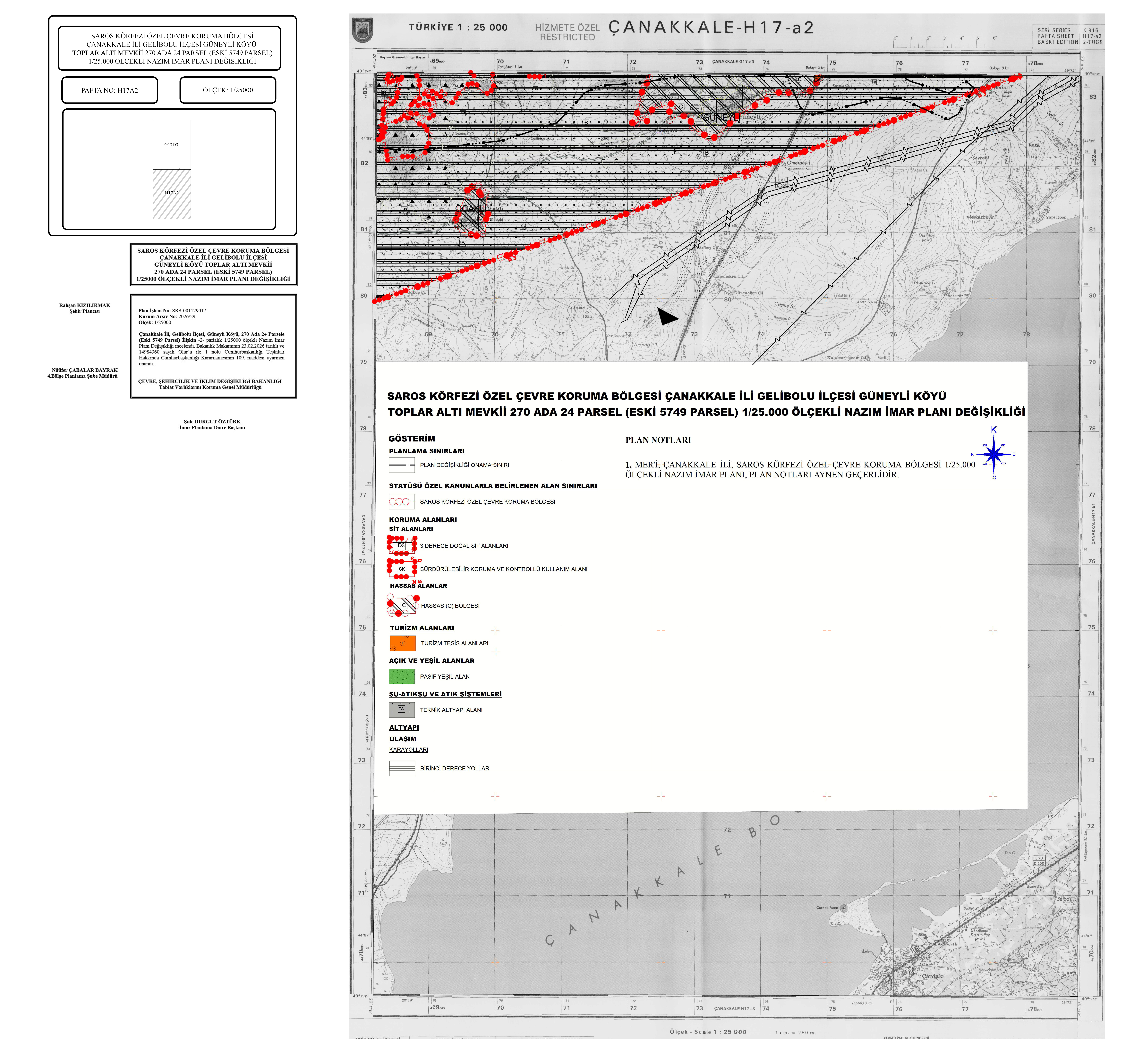 Saros Körfezi Özel Çevre Koruma Bölgesi ve Sürdürülebilir Koruma ve Kontrollü Kullanım Alanında kalan, Çanakkale İli, Gelibolu İlçesi, Güneyli Köyü, Toplaraltı Mevkii, 270 ada 24 parsel (eski 5749) parsele ait 1/25000 ölçekli Nazım İmar Planı Değişikliği, 1/5000 ölçekli İlave Koruma Amaçlı Nazım İmar Planı ve 1/1000 ölçekli İlave Koruma Amaçlı Uygulama İmar Planı Bakanlık Makamının 23.02.2026 tarih ve 14984360 sayılı Olurları ile 1 nolu Cumhurbaşkanlığı Kararnamesinin 109. Maddesi uyarınca onaylanmış olup 16.04.2026 tarihinde Çanakkale Çevre, Şehircilik ve İklim Değişikliği İl Müdürlüğü ilan tahtasında 30 (otuz) gün süre ile askıya çıkarılmıştır.
